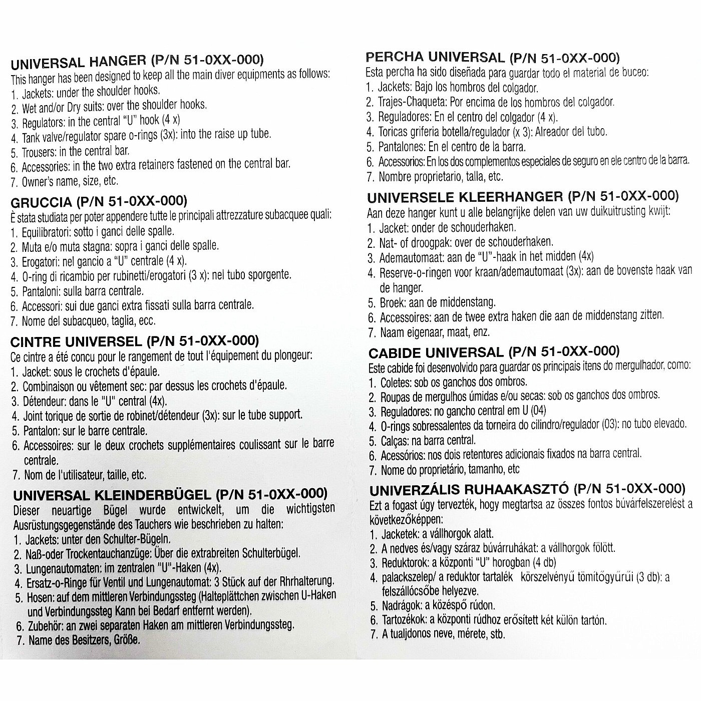 Na hlavnú tyč alebo ramenný hák bez problému zavesíte neoprénový oblek a U háčik dobre poslúži na zavesenie automatiky. Kompenzátor vztlaku zase ideálne padne na ramenné háčiky. Neoprénové topánky môžete upevniť na špeciálne držiaky. Svoje miesto je určené aj pre o-krúžky k ventilu potápačskej fľaše.